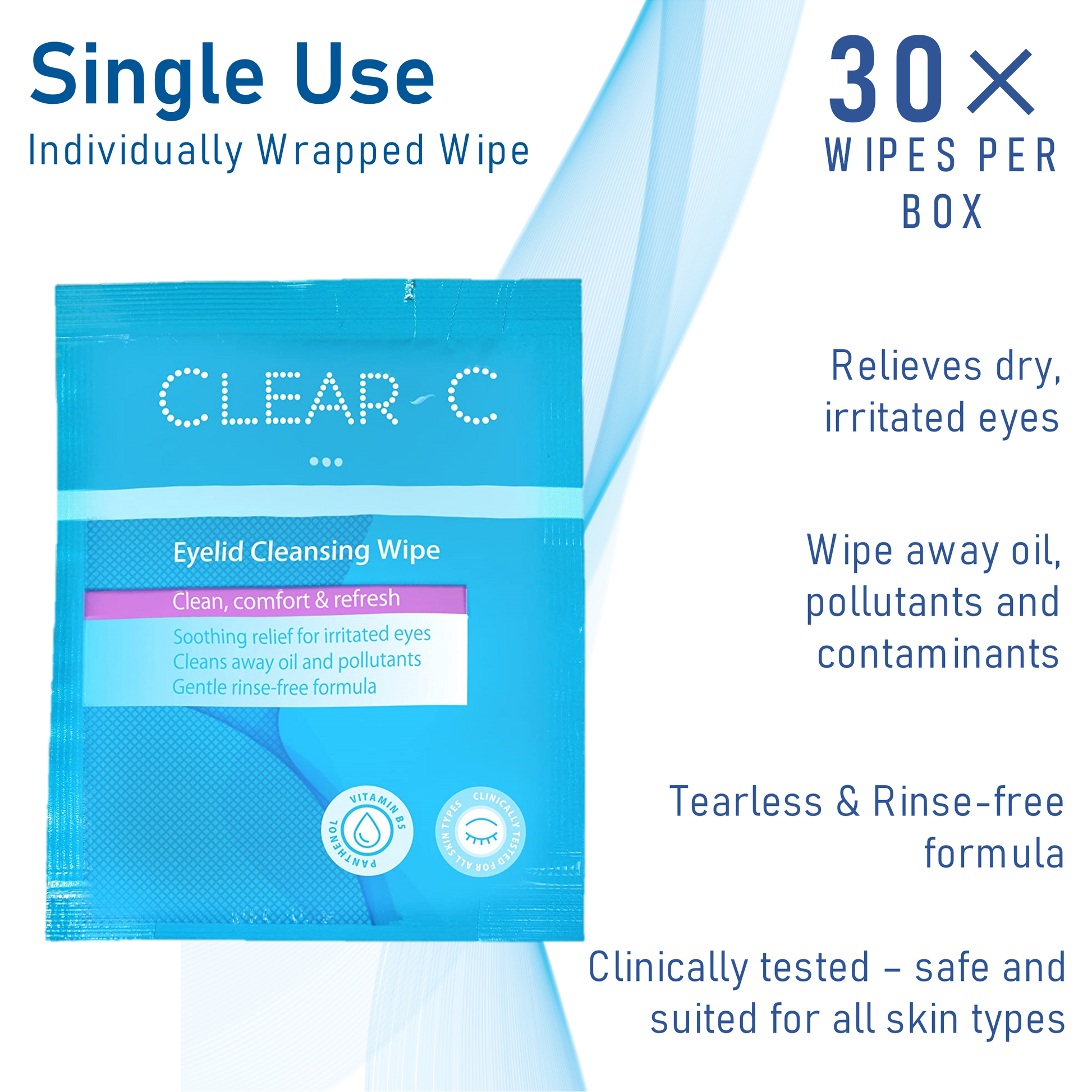 Clean, comfort, and refresh your irritated eyes with clear C eyelid cleansing wipes. Clinically tested for safety and suited for all skin types, it can remove oil and other contaminants and provides soothing relief.
